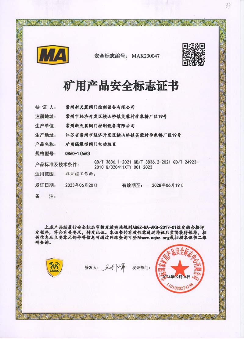 礦用產品安全標志證書QB20-1(380)